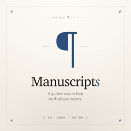 Manuscripts is a Mac app for academics who’ve outgrown the spreadsheet. Draft, submit, revise: each paper with its own jacket. No cloud. No seats. Yours.